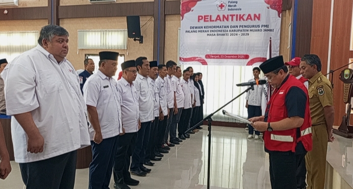 Pelantikan Dewan Kehormatan, Dewan Pengawas, dan Pengurus PMI Kabupaten Muaro Jambi berlangsung khidmat di Aula Kantor BPKAD Muaro Jambi, Bukit Baling, Kecamatan Sekernan, Selasa (23/12/2025).